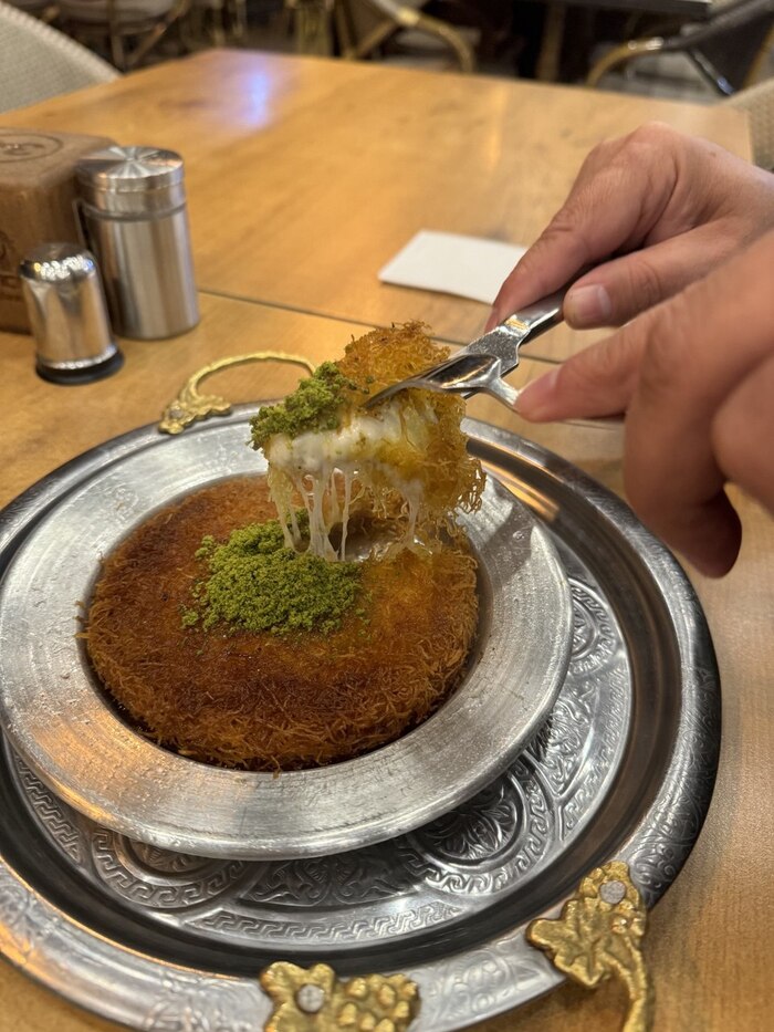 Ну и о главном. Еда. Бурса — родина Искендер-кебаба (это когда мясо поливают раскаленным маслом и йогуртом), но его я съел быстрее, чем сфоткал. Зато успел запечатлеть Кюнефе. Это горячий десерт из теста-паутинки с сыром внутри. Сыр тянется, сироп течет, лицо довольное. Сладкоежкам на заметку: это очень сладко, берите чай без сахара.