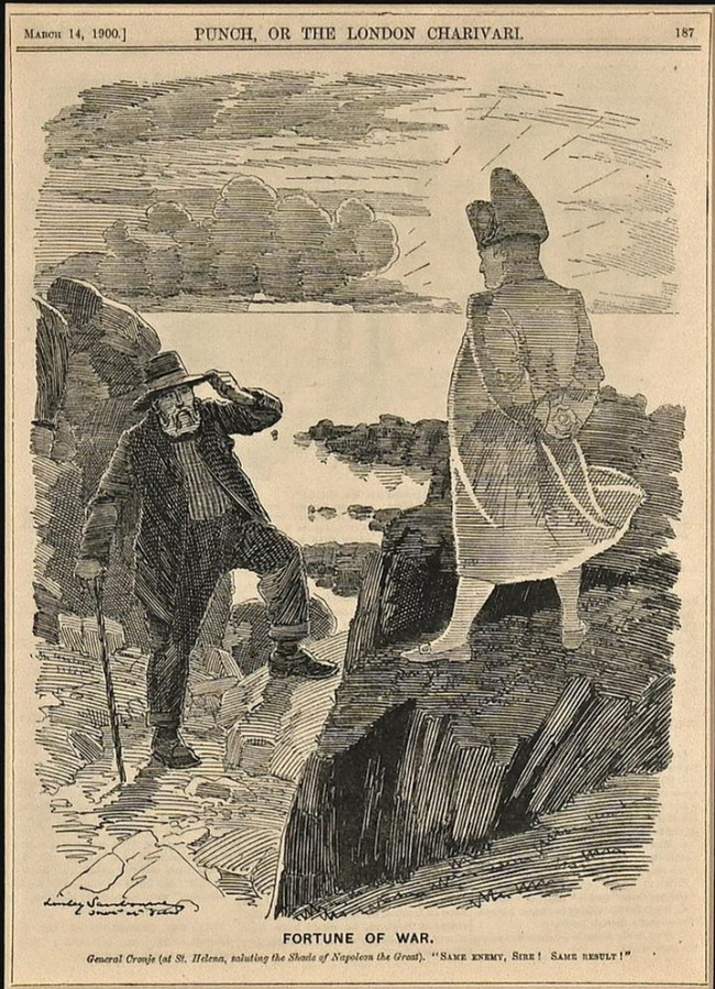 Источник: Южно-Африканское Военно-Историческое общество, Военно-Исторический журнал, Т. 11 No 3/4 - октябрь 1999 (Die Suid-Afrikaanse Krygshistoriese Vereniging, Military History Journal. Vol 11 No 3/4 - October 1999). А.Я.Натан (A.J.Nathan). Бурские военнопленные на острове Святой Елены. Во время Южноафриканской войны 1899–1902 годов британцы взяли в плен до 20 000 человек, в результате чего лагеря для военнопленных в Южной Африке были переполнены. Те лагеря, которые располагались в Капской колонии, также стали особенно уязвимыми для атак противника. Эти трудности повлияли на решение отправить пленных на Бермудские острова, в Индию, на Цейлон (современная Шри-Ланка) и на остров Святой Елены. Бурский генерал Пьет Кронье был среди первого контингента из 514 человек, прибывшего на остров Святой Елены на борту войскового транспорта Milwaukee в сопровождении крейсера HMS Niobe. 27 февраля 1900 года Кронье сдался лорду Робертсу после сражения при Паардеберге. Иллюстрируя его прибытие на остров Святой Елены, журнал Punch изобразил бурского генерала, приветствующего призрак Наполеона словами: «Тот же враг, сир! Тот же результат!»