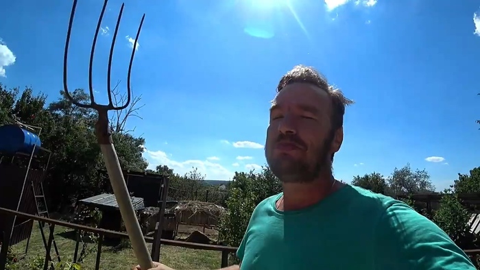 Трава вырвана, и пора ее убирать. Для удобства беру свои любимые вилы.
