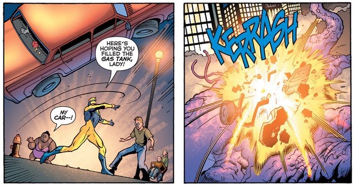 О мощности силового поля Бустера Голда говорит и то, что Бустер выжил после того, как его избил взбешённый Думсдэй (существо, «убившее» Супермэна). Да – был серьёзно ранен. Да – генератор силового поля перегорел после этого. Но выдержать удар Думсдэя непросто. Супермэн вон не выдержал.