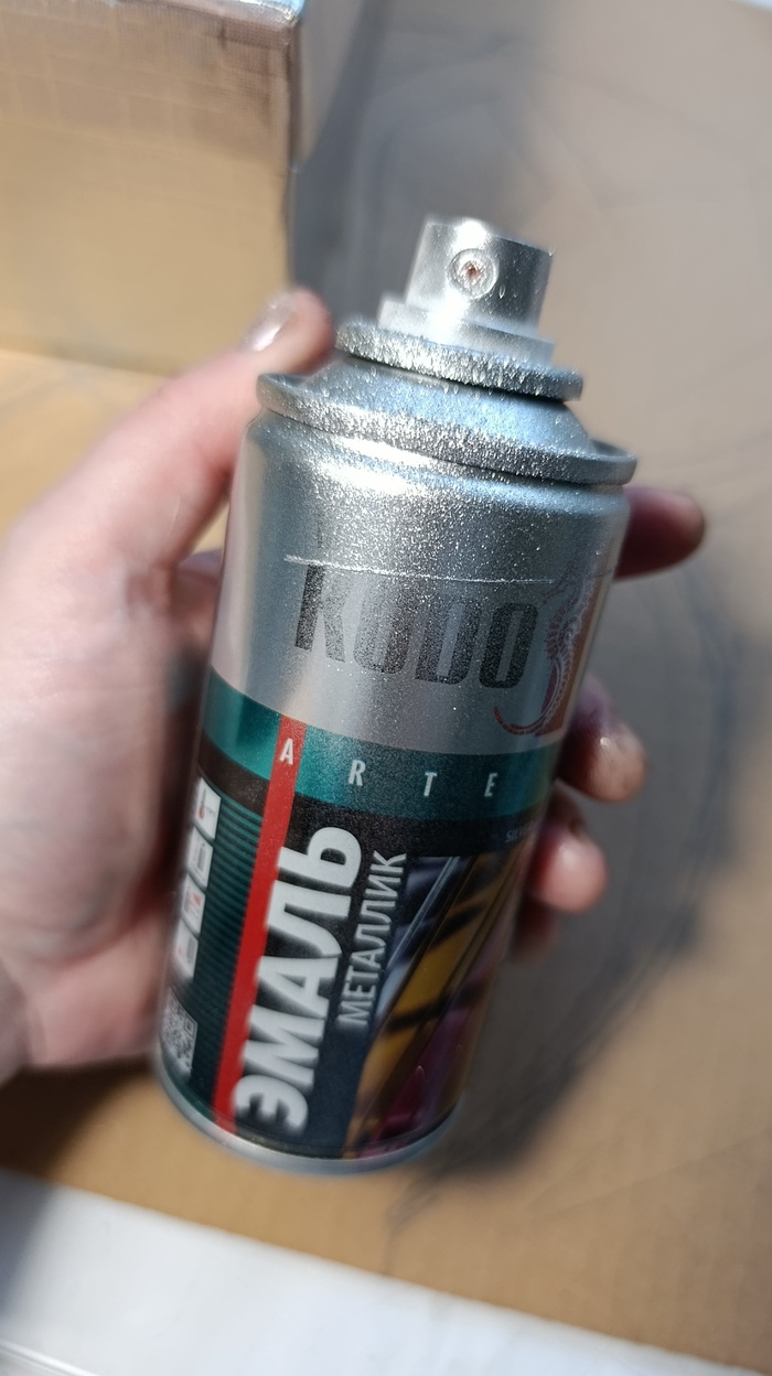 Краску взяла из того, что было в ашане в строительном отделе. Вообще кудо металлик оказалась с ярко выраженным шиммером, и на первый взгляд выбор показался неудачным, было ощущение некоторой "рыхлости" поверхности из-за мельтешения металлических частиц (хорошо видно по следам от краски на баллончике). Ну и на металл вообще не похоже было. Однако, когда после покрытия серебрянкой я взялась за чернение, я поняла, что выбор был идеален. Именно эта похабная на первый взгляд рыхлость придала весь необходимый шарм.
