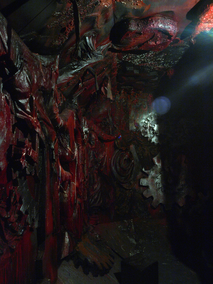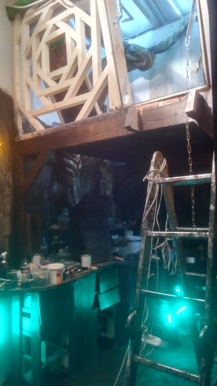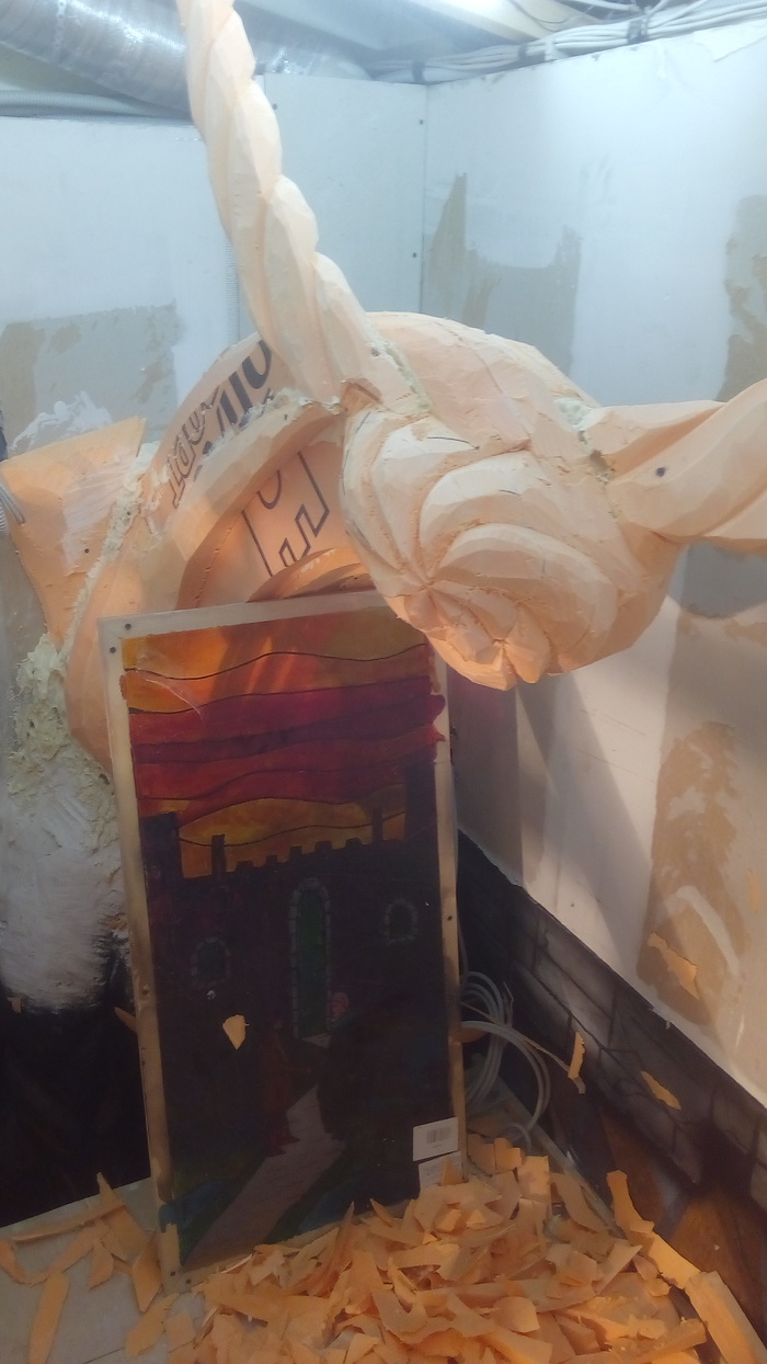 Ввиду чуть более, чем овер сжатых сроков и сомнительности такой узкой и длинной конструкции из гипса, мы заменили материал исполнения на пеноплекс. Топорность форм диктовалась все тем же мирно сидящим этажом ниже туловом, а вот сама форма - единственынм ее эскизом.