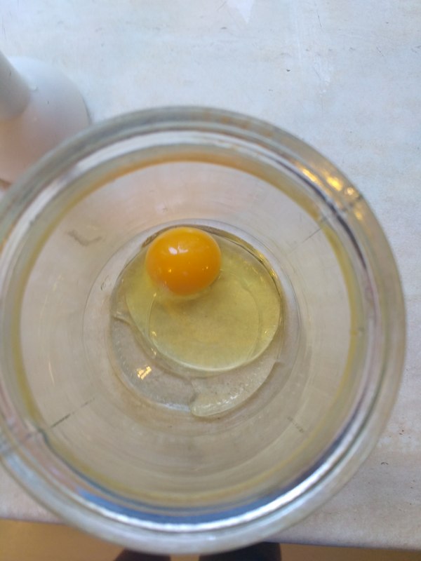Берём банку, в которой майонез будет храниться ( зачем нам лишняя посуда?) И разбиваем яйцо. Лучше домашнее. Или перепелиных 4. С белком ( приверженцы классического рецепта меня проклянут, но так быстрее).