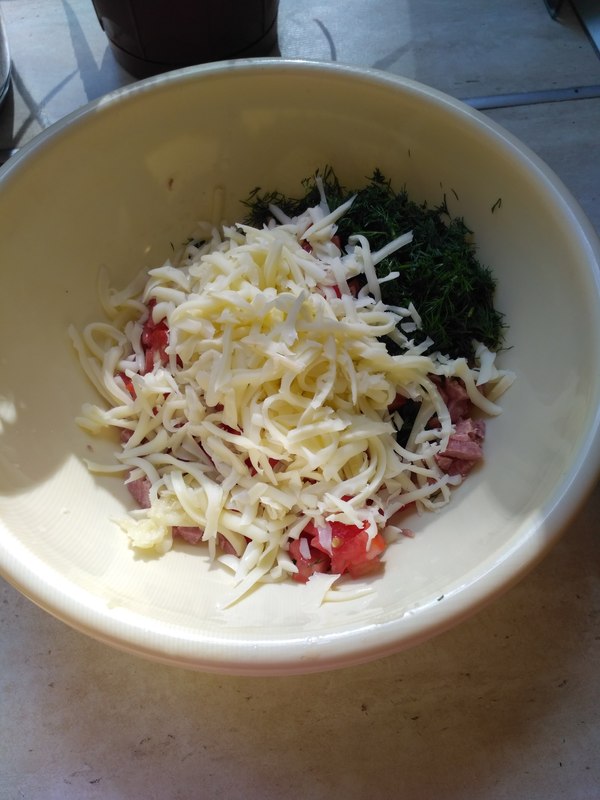 Колбаска. У меня варено - копчёная. Режем кубиком.