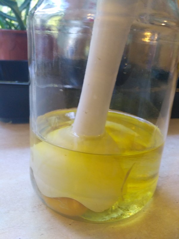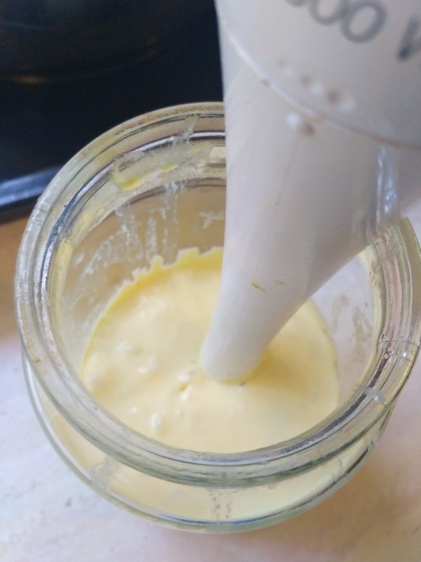Ставим погруженной блендерна дно так, чтобы желток оказался внутри блендера. В идеале и горчица тоже - они оба выступают эмульгаторами. И включаем.