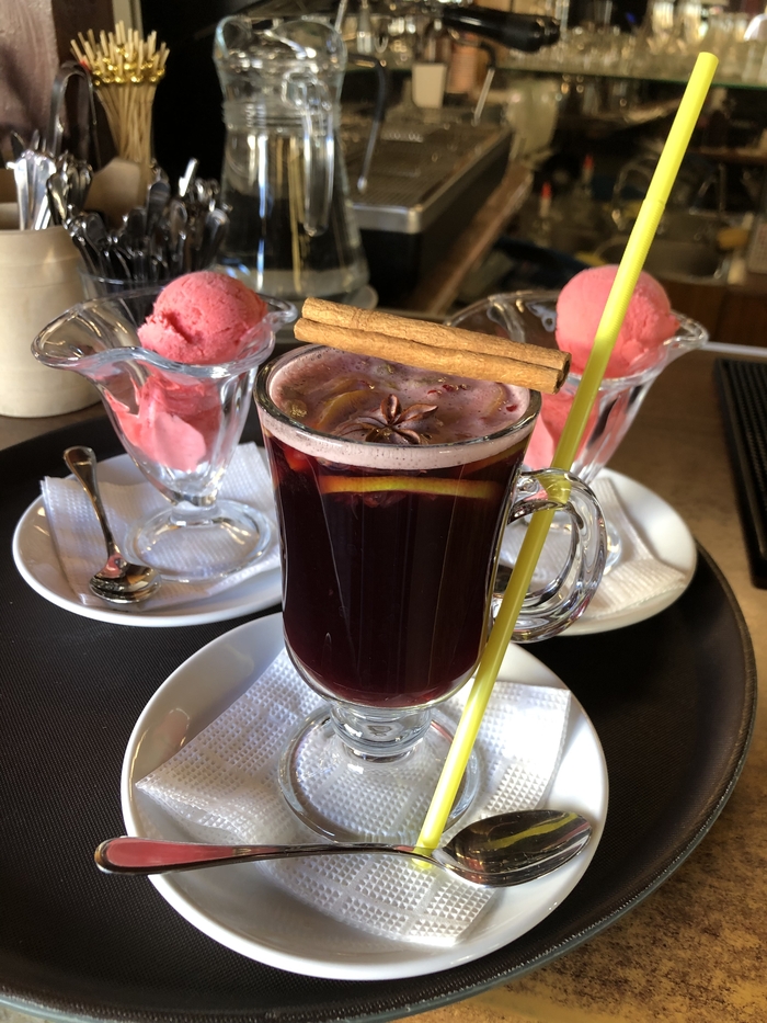 Я взяла кофе и булочку с яблочной начинкой.