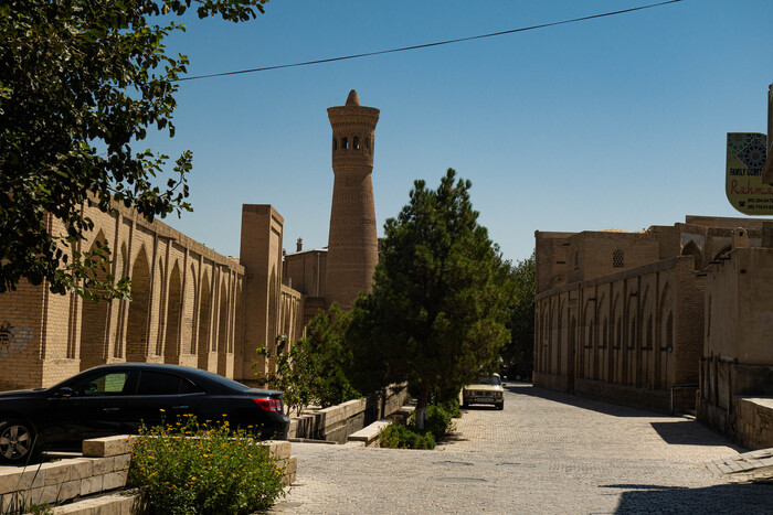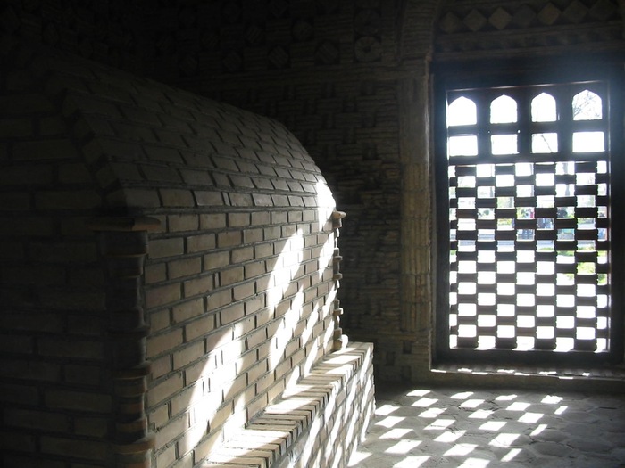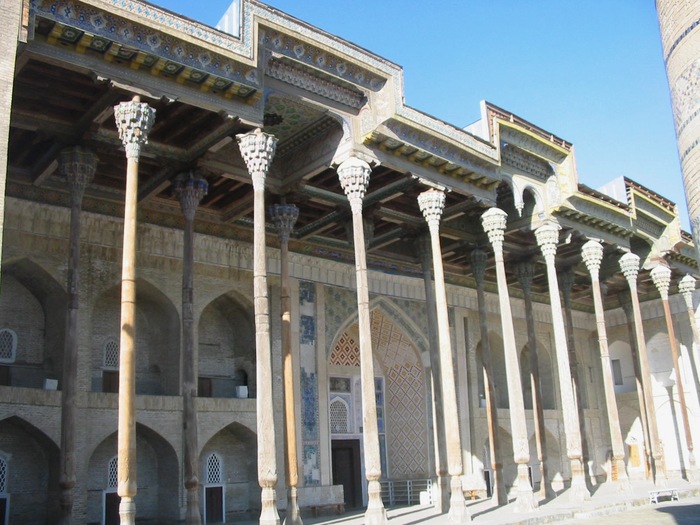 Минарет Калян (Большой) виден из разных концов Бухары (в том числе и из нашего геста). Он очень хорош собой - 46,5 метров в высоту, украшен затейливой резьбой и сурами из Корана. Был построен в 1127 году и за почти 900 лет ни разу не ремонтировался. Так что до сих пор можно заметить, что на стороне, повернутой к жилым кварталам, орнамент поврежден – это следы от снарядов большевиков. Минарет пытались уничтожить в начале 20-х годов прошлого века по приказу Фрунзе. Но он устоял, как устоял и раньше – перед набегами монголо-татар. По преданию, когда Чингисхан смотрел на него, с завоевателя упала шапка. Подняв ее, он приказал сжечь город, но не трогать минарет – ведь никто и ничто доселе не заставляло его поклониться.