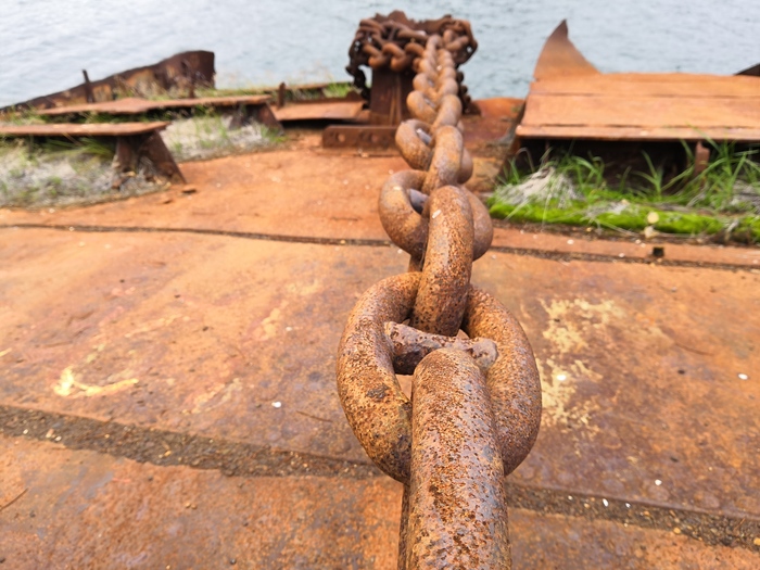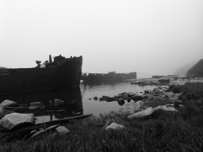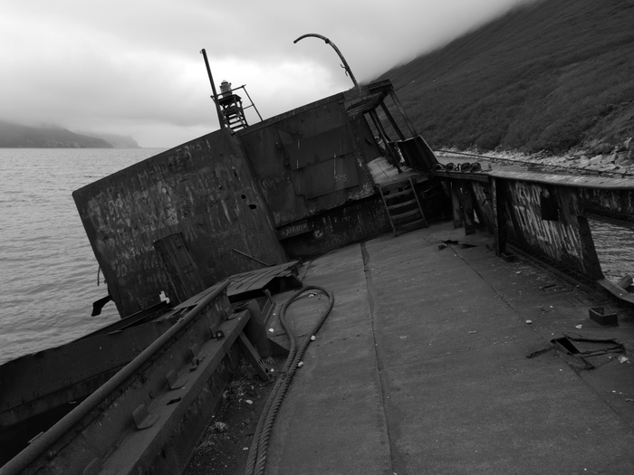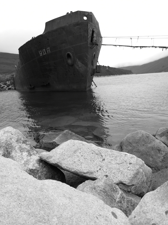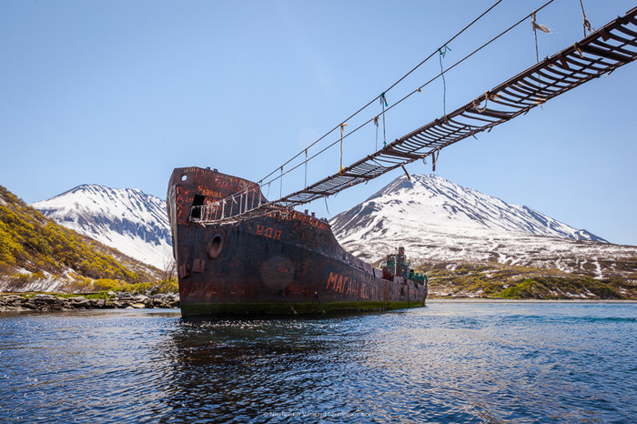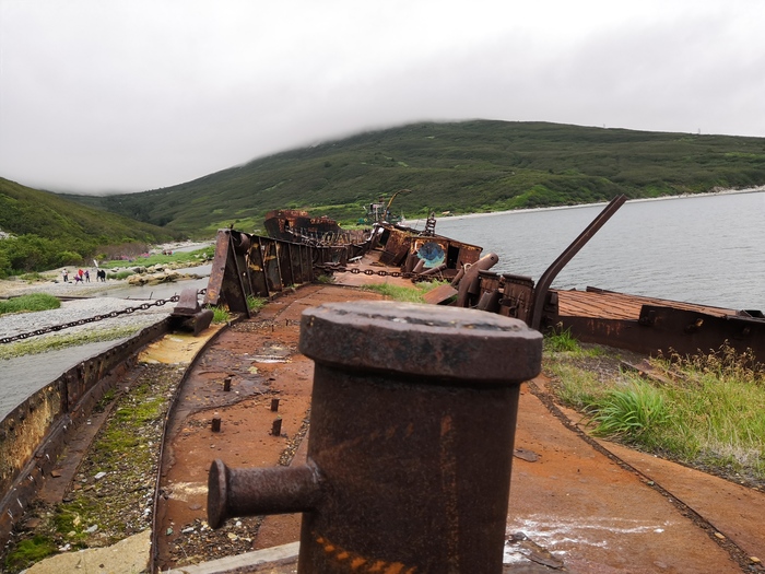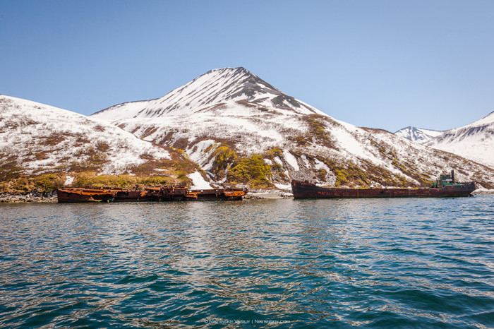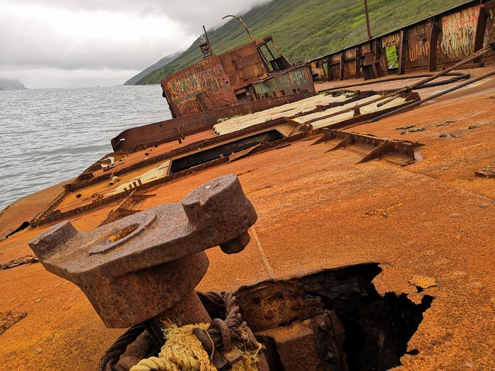 Вместе с «Акваторией» мы швартуемся к старому сухогрузу, затопленному у берега. На борту краской написано «Магаданец». Следом за нами в бухту заходит двухмачтовая парусная яхта «Абель Тасман» из Новой Зеландии. Белоснежные паруса гармонично смотрятся на фоне тёмно-синей воды.