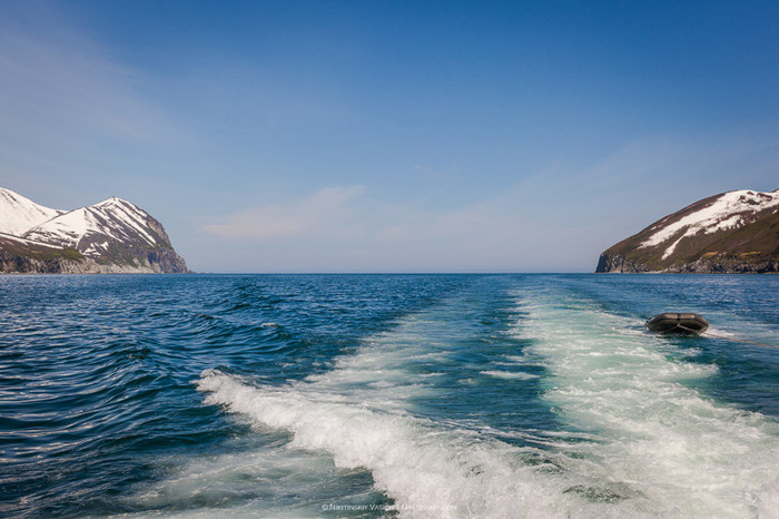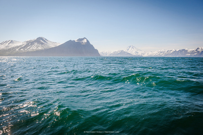 Получив разрешение портовых властей, отходим от причала в Авачинскую бухту. Проходим мимо величественных скал «Трёх братьев» в открытое море. Поднимаюсь на мостик. Погода великолепная, на море практически штиль. Свежий морской ветерок приятно дует в лицо. Капитан Сергей как обычно рассказывает байки про свои походы с гостями Камчатки.