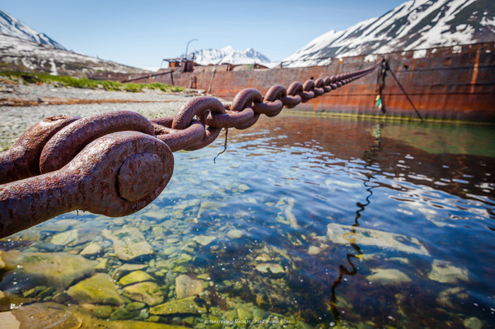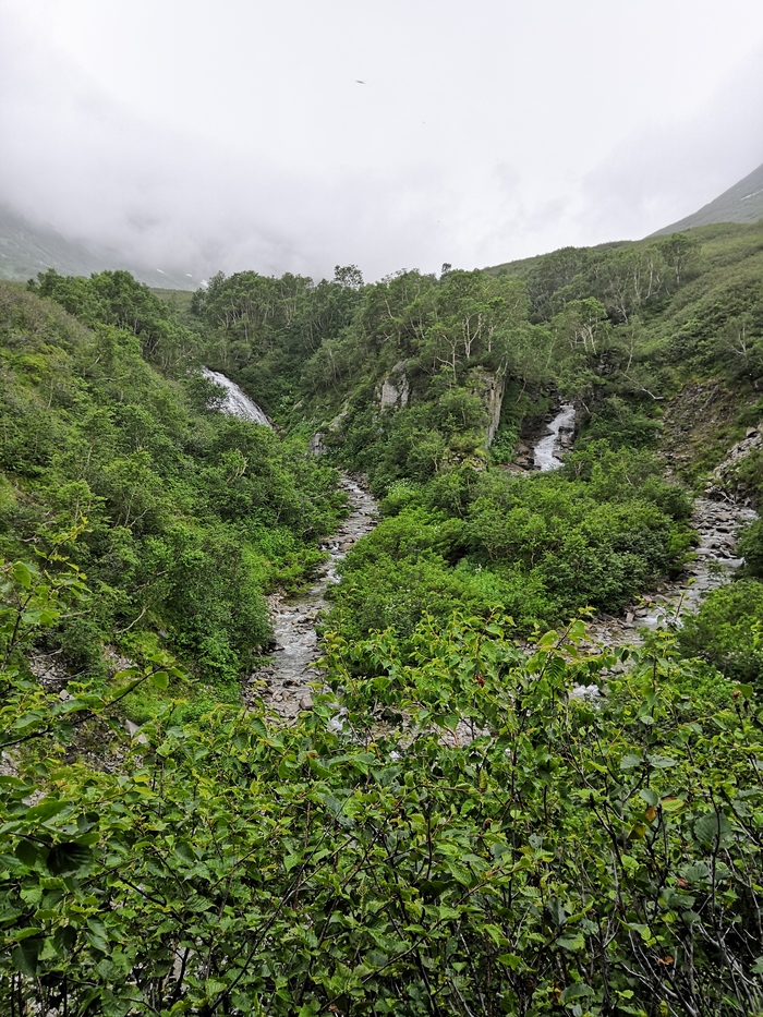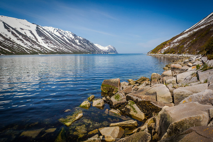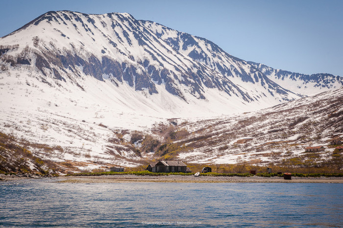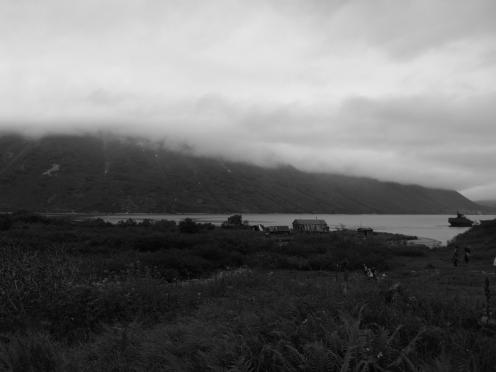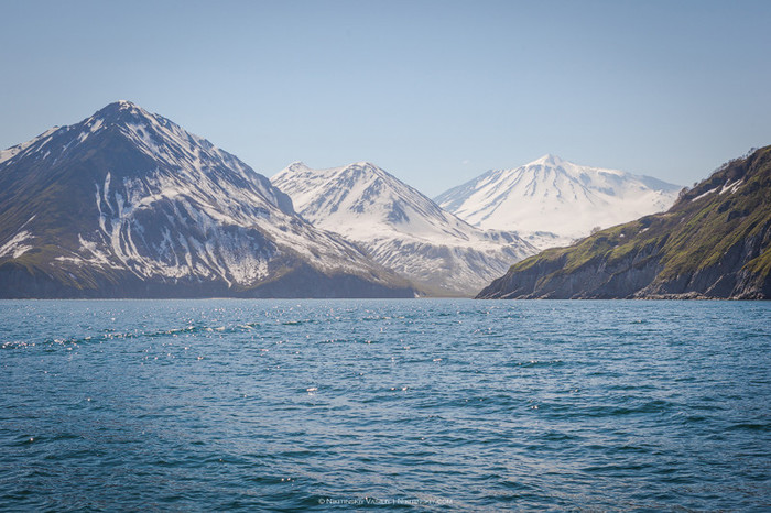 Мы заходим в бухту Русская. Своей формой она напоминает фиорд. С сопок сбегают водопады от тающих ледников. По крутому снежному склону бегут три медведя. Это дикие места, не тронутые цивилизацией.