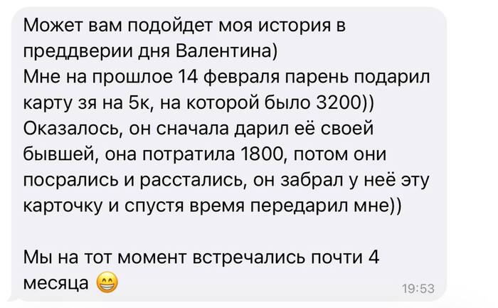 Короткая кринж история про бывшего. Мне тогда было лет 19 и я, наверное, плохо разбиралась в людях. Почти год была в нездоровых отношениях, но сейчас не совсем об этом… дело близилось к моему дню рождения, мой молодой человек начал заводить тему о подарке. Я сразу сказала, что ничего не нужно, это лишнее. Он ответил, что это как-то неправильно и я должна себе выбрать какой-нибудь подарок, но не дороже 2-х тысяч. Я все же настаивала, что мне ничего не нужно да и не хотелось мне самой себе что-то придумывать, честно говоря.
