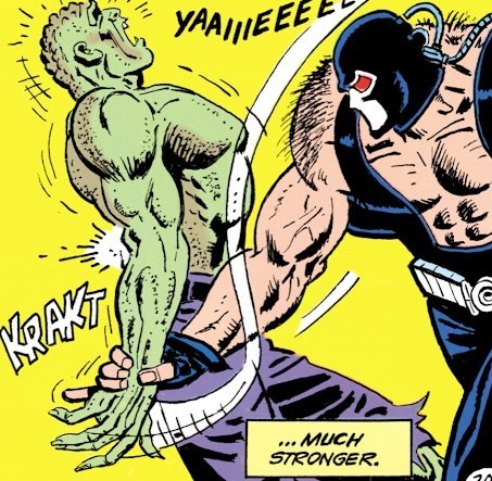 За буйством Крока наблюдает Бэйн, новый преступный элемент Готэма, и планирует Крока остановить. Не из альтруистичных позывов – просто от прихвостней он узнаёт, что Крок офигенно сильный и Бэтмэн его побеждал исключительно на удаче и сюжетной броне. Логика Бэйна: «Отметелю Крока – докажу сам себе, что я круче прославленного Тёмного Рыцаря, и Крок станет одной из ступенек, ведущих меня к власти над Готэмом». Новости о буйстве Крока также смотрят Альфред и Тим Дрейк, Робин. И понимают, что надо что-то делать, но Бэтмэн в кои-то веки спит. Так что Тим призывает Жан-Поля Валли и выдаёт ему запасной Бэткостюм. Робин и врио Бэтмэна отправляются бить морду Кроку...а получается так себе. Точнее, не получается вообще. Да, чисто физически Жан-Поль сильнее Бэтмэна, но не дотягивает по уровню навыков. И тут объявляется Бэйн, обширянный отборной Отравой. И ломает Кроку обе руки. И ушатывает Крока об стену. И обращается к Бэтмэну. «А теперь я буду ломать тебя! Так, стоп! Ты не Бэтмэн! Да тебя даже бить нет смысла, иди потеряйся. Я хочу сломать НАСТОЯЩЕГО Бэтмэна, а не самозванца!». Бэйн сваливает. Жан-Поль и Тим в непонятках возвращаются в Бэтпещеру. Немного о целостности вселенной: Бэтмэн, Робин и Жан-Поль в этом и нескольких следующих выпусках носят нарукавные повязки с символом Супермэна. Потому что Супермэн как раз недавно погиб в битве с Думсдэем, эти повязки раздаются бесплатно в знак почёта и траура.