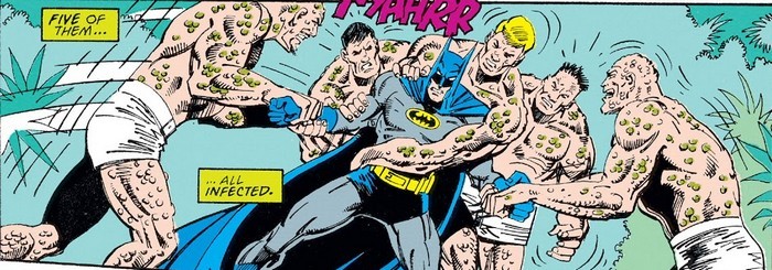 А время идёт, а злодеев ещё дофига, а я перехожу к комиксу Batman #495 за июнь 1993 года, от Дуга Мюнха и Джима Апаро. Комикс начинается с того, что Бэтмэн чуть не погибает в огне во время стычки со Светляком. Тёмный Рыцарь спасается, уцепившись за улетающего Светляка, но в итоге упускает поджигателя и совершает жёсткую посадку. Рыцарь Помятого Образа возвращается в Бэтпещеру ни с чем, и Альфред напоминает, что Брюсу Уэйну обязательно надо появиться на званом вечере фонда Уэйнов, иначе нехорошие слухи пойдут. Брюс и не против – тем более, там наверняка заявятся злодеи. И действительно – на ужин намерена заявиться Ядовитый Плющ и навести шороху, а Бэйну очень интересно, что из этого выйдет. Жан-Поль Валли же без спросу берёт костюм ниндзя и идёт на улицы – ради «крещения боем». А перепуганный мэр Готэма посылает полицию к чёрту на рога, потому что Джокер и Пугало пошатали ему мозгу.