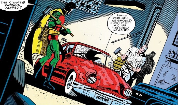 Печальный хруст позвоночника Тёмного Рыцаря ознаменует конец сегодняшней части подборки в комиксе Batman #498 за август 1993 года, от Дуга Мюнха и Джима Апаро. Сломав Бэтмэна, Бэйн покинул Бэтпещеру, и теперь кошмарит город, его банда тупо отстреливает всех преступников, не согласившихся под него прогнуться. Мирным жителям тоже достаётся, разумеется. Брюс Уэйн жив – но он в глубокой депрессии, да и Тим едва может сдержать слёзы – его наставник, великий и могучий Бэтмэн – сломанная развалина, считающая себя пылью под плинтусом. Тим, Альфред и Жан-Поль Валли переносят Брюса в одну из комнат поместья, а затем берут кувалды и идут в гараж, ломать крутой Порш: нужно же создать реалистичную историю того, почему Брюс Уэйн искалечен. Просто замотанный богатей решил понтануться и развеяться, превысил скорость и намотался на столб. Именно так всё и было. После этого Жан-Поль (он же всё-таки ещё и офигенный электронщик) идёт запиливать новую, усовершенствованную систему безопасности для поместья Уэйнов.