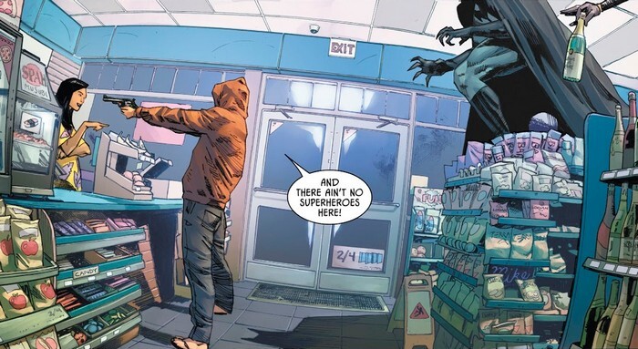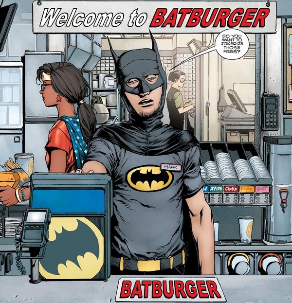 И к спасению он сможет приступить уже в комиксе Batman #3. Молодая семья решает срезать путь по подворотням, и к ним выходит обрыган с пистолетом. Но новой трагедии Уэйнов из этого не выйдет – Бэтмэн парой ударов выбивает из обрыгана боевой дух и утаскивает его к ближайшему полицейскому участку. Это произошло несколько лет назад. Сейчас Брюс Уэйн, замаскировавшись до неузнаваемости, общается с той самой семьёй, Кловерами, дети которых подросли и стали Готэмом и Готэм Гёрл. Как они до такого докатились? Ну, много тренировались, развивали как тело, так и разум. Но суперсилы просто так не появляются! Ну...Генри и Клэр (так готэмских суперов зовут...супер по имени Генри...кто бы мог его сыграть?) отправились волонтёрить в Африку, и в какой-то момент попросили родителей перевести им крупную сумму денег. Родители так и сделали – и дети вернулись с суперсилами. Пока родители это рассказывают, Альфред сообщает – в Готэме взорвался смертник, выкрикнув “Монстры идут!”. И так “удачно” взорвался, что повредил опоры моста, и этот самый мост не простоит и четыре минуты!