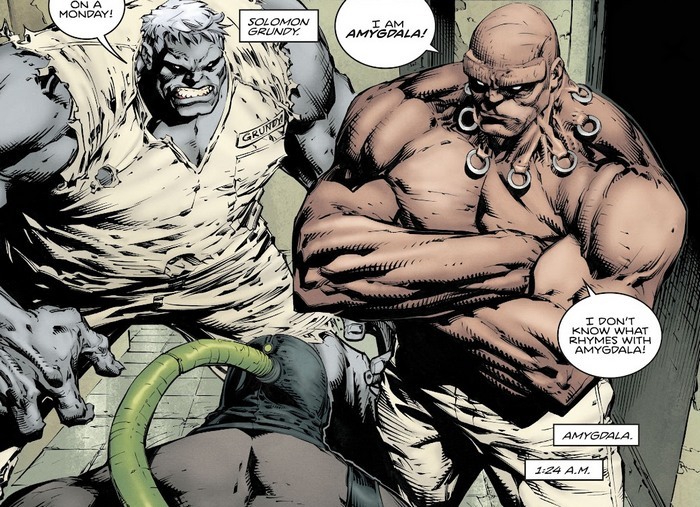 Психанув, Бэйн идёт убивать Бэтмэна в лечебницу “Аркхэм”, куда тот отправился – и в комикс Batman #19. Психам в Аркхэме было дано задание: по возможности задержать Бэйна, в идеале – и вовсе обезвредить, не убивая. Кто выполнит свою роль, тому улучшат условия содержания. Выходят против Бэйна Соломон Гранди и Амигдала. А Бэйн им такой: “Я мучение. Я разруха. Я чума. Я отрава. Я Бэйн! Вы стоите у меня на пути, а значит, стоять вы больше не будете!”. Признаться, тут даже живой мертвец нервничать начинает. Несколькими ударами Бэйн делает из обоих амбалов отбивные. Пугало, следующая линия обороны, обжабывает Бэйна своим газом. “Начались кошмары? Ну-ка, опиши их мне! – Я Бэйн! Я порождаю кошмары!”. А в тщательно защищённой комнате в Аркхэме истерит Альфред, яростно подлечивая побитого Бэтмэна. “Мастер Брюс! Вы освободили психов?! ВООРУЖИЛИ ИХ?! Вы вкрай долбанулись?! Просто бегите! – Один раз уже сбежал, ничем хорошим это не закончилось. Мне нельзя убегать. Бэйн убил Готэма, морально искалечил Готэм Гёрл, подстрелил Селину, повесил моих мальчиков, моего сына!”.