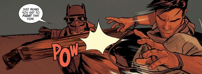 В общем, пора перейти к комиксу Batman #73. Томас Уэйн, Бэтмэн вселенной Флэшпоинта, чешет куда-то по пустыне верхом на лошади, которая тащит за собой бронированный гроб, а ещё через круп лошади перекинут, как мешок с картошкой, сломанный, но живой Брюс. Наутро на Томаса нападают ниндзя, вежливо представившись и сообщив “Мы есть смерть в пустыне, а ты не Бэтмэн”. А он такой “Теперь я Бэтмэн” и раскидывает их как нефиг делать, напевая песенку. Пески, Бэтмэн в длиннополом пальто и гогглах – нужно же было куда-то втулить тот костюм из БпС. Вечером Брюс просыпается и такой “Где Бэйн?!”. И пытается прописать “бате” по щщам. И сам получает по лицу. И Томас пытается “сына” утешить. “Ну-ну. Ты многое пережил. Ты восстановишься. Я понимаю, ты боишься. Это нормально. Все боятся. Твоя битва окончена. Ты проиграл. Все твои страхи и сомнения остались далеко позади, в Готэме. Пора восстановиться и показать, как ты силён. Мой малыш, тебе больше не нужно волноваться. Папа с тобой”. И Брюс обнимает отца. “Кстати, пап, где мы? – Я, кстати, тебе хребет починил. Но лучше пока не топай пешком. Я пойду пешком, а ты садись в седло. Мы примерно в сотне миль от Хадима. – Хадима? Это...не понял. – Ничего, родной. Анестезия закончит действовать, поймёшь. – Ладно, а что в гробу? – Это ты тоже поймёшь. Ты лучший в мире детектив, сынок. Ты всё поймёшь”.