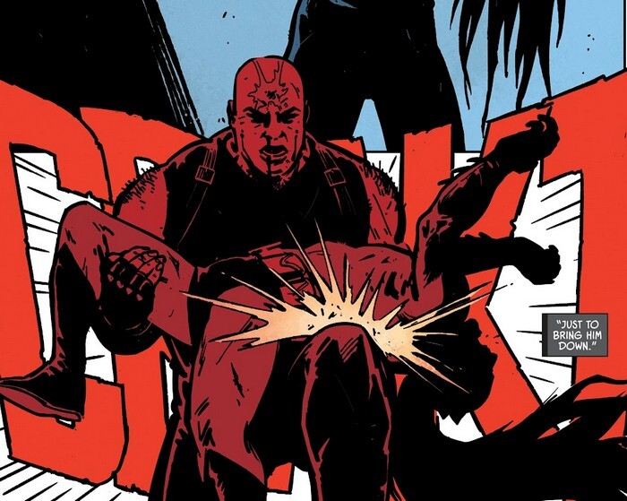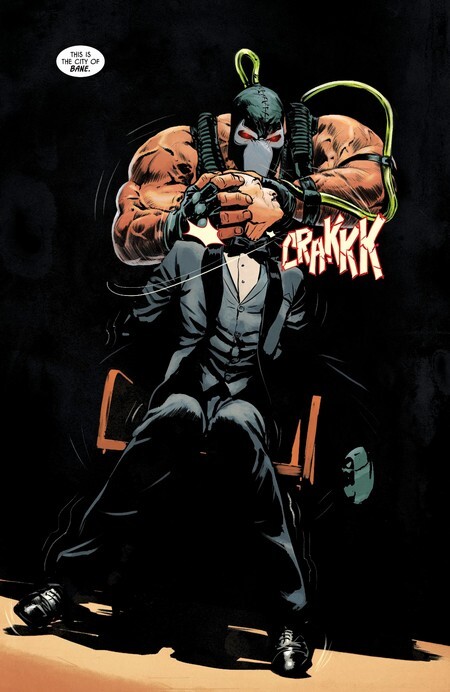 А дальше комикс Batman #13. Альфред Пенниуорт наводит порядок в Бэтпещере, как вдруг там появляется Аманда Уоллер. “Мистер Пенниуорт, не пугайтесь, я здесь не для противостояния, я просто заберу несколько файлов и уйду. – Если бы Бэтмэн был здесь... – Но его здесь нет, он прямо сейчас умирает на миссии в Санта Приске, на которую ему пришлось отправиться из-за моей досадной и абсолютно точно случайной оплошности”. Ну а в Санта Приске Бэйн, не потрудившись надеть хотя бы трусы, избивает Бэтмэна в пюрешку, да ещё и не затыкается: “Психо-Пират поможет, Бэтмэн! Он и меня вылечил, и тебя вылечит! Он кого угодно может сделать счастливым, круче любой Отравы! Просто скажи, Бэтмэн. Скажи, что хочешь быть счастливым. что хочешь остановиться. Скажи, чекго хочешь? – Я хочу сломать твою чёртову спину!”. И тут начинается движняк. Для начала, Джувили и Панч встают – они живы! Пожевав особой жвачки и надув пузыри, они покрывают друг друга защитной плёнкой и эвакуируются. Бронзовый Тигр же втыкает в вену шприц с Отравой и бежит к Вескеру, который ждёт ровно в том месте, где должен.