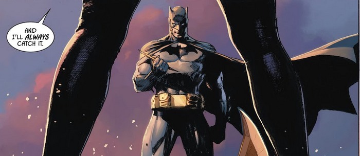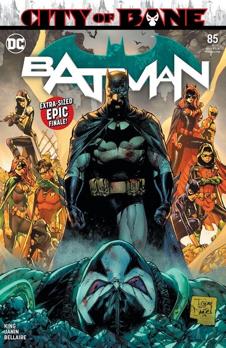 Сегодняшний заезд начнётся с комикса Batman #81 за декабрь 2019 года, с историей от Тома Кинга и рисунком от Джона Ромиты-младшего и Митча Джерадса. Томас Уэйн (Бэтмэн вселенной Флэшпоинта) собирается уже убить Дэмиена Уэйна (Робина нормальной вселенной), но не может пойти на такое – “Всё-таки мы семья, ты мой внучок”. А Дэмиен такой “Эх ты, неважный ты старик. Не семья мы. Дворецкий был семьёй. Мой отец – моя семья. И ОНИ – тоже моя семья!”. ОНИ – это прибывшие спасать пацана Бэтвумэн, Бэтгёрл, Охотница, Сирота, Сигнал и Робин (Тим Дрейк). Бэтмэн и Женщина-Кошка в это время надирают зад Соломону Гранди и Амигдале и Бэтмэн объясняет своё мастерство коммуницировать через удары, что правильно нанесенным ударом может целое послание передать тем, кто знает, как “прочитать”. А Бэт-Семья нападает на Томаса Уэйна, и любители комиксов на этом моменте вновь начинают возмущаться, потому что Томас (который, по оригинальной задумке, далёк до навыков Брюса, и потому пользуется огнестрелом и нечестными приёмами) оказывается столь очешуевертительно лихим, что после первой порции зипдячек встаёт и раскидывает Бэтсемью, как мышат. Сильнее всего достаётся Тиму Дрейку, его Томас тяжело ранит стрелой, которую в него попыталась воткнуть Охотница.