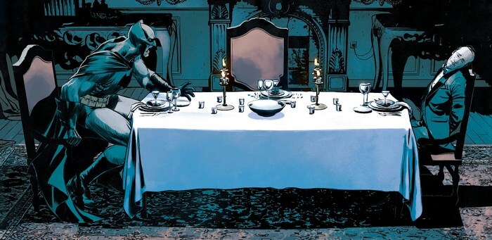 Говорильня – это хорошо, но где же экшен? Давайте поищем в комиксе Batman #54 за октябрь 2018 года, от Тома Кинга и Мэтта Вагнера. Начинается комикс с воспоминания о трагедии, происшедшей с Летучими Грейсонами, после которой Дик Грейсон осиротел. Сейчас же уже взрослый Дик , он же Найтвинг, в компании Бэтмэна противостоит Безумному Лоскутнику. Или нет? Сюжет скачет по таймлайну Дика Грейсона бешеным галопом. Юный Дик, только недавно переживший смерть родителей, просыпается от кошмара в своей спальне в поместье Уэйнов. Взрослый Дик заканчивает свою карьеру Бэтмэна с возвращением Брюса Уэйна к роли Тёмного Рыцаря. “Ты больше не Бэтмэн, Дик. Как долго ты будешь оставаться в Готэме? – Пока ты во мне нуждаешься, Брюс. – Я в тебе не нуждаюсь”. Дик-ребёнок капризничает и не хочет есть приготовленные Альфредом бутерброды с огурцами. Найтвинг не может сдержать ржач от нелепости ситуации – Бэтмэн сражается с Королём Специй, преступником, оружие которого – модифицированные до убойной степени кетчуп и горчица.