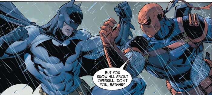 И вот после всего этого ломания Бэтмэна, с хитровыпендренным планом и смертью Альфреда комикс Batman #86 от Джеймса Тиниона и Тони С. Дэниела, обещает презентовать “Самую опасную историю о Бэтмэне”. Потому что предыдущие 85 выпусков был детский сад. Не говоря уже о том, что было до этого. Так вот – в Готэме происходит слёт наёмников, среди которых Чешир, а также двое опасных новичков – Гансмит и Мистер Зубы. А Бэтмэн собирается опробовать новое транспортное средство, разработанное по его приказу Люциусом Фоксом. “Оно готово? – Ну как сказать...будь это что-нибудь законное и сделанное по всем правилам, я бы сказал, что нужно ещё полгода тестировать на манекенах. – Оно соответствует требованиям? – Да. – Оно полетит? – Ну как сказать...может ли оно летать? Да. Полетит ли оно? Вот это вопрос веры. Постарайтесь не сломать, а то я скажу вам, сколько стоило его построить”. Бэтмэн не смущается и использует новое транспортное средство, чтобы напасть на слёт наёмников, самый опасный из которых – Слэйд Уилсон, Дэфстроук.