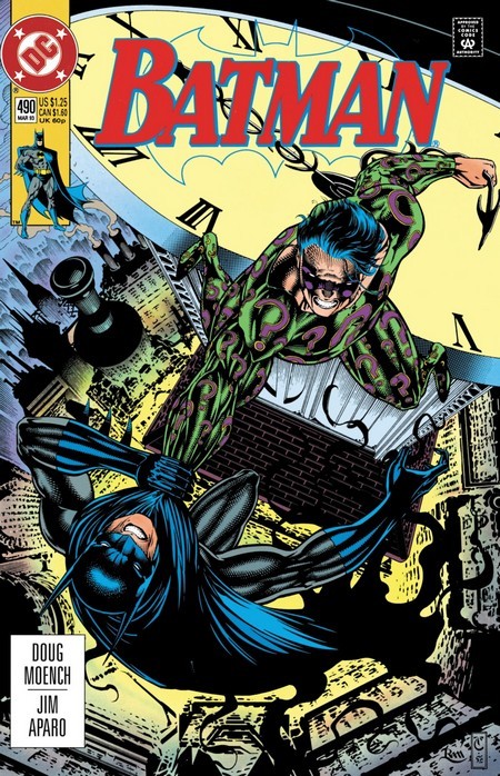 А на очереди комикс Batman #490. Стало ли Брюсу лучше после снотворных? Нет, он всё так же измотан, только теперь его ещё и шатает (последствия снотворного), и бросает в холодный пот, и он всё ещё измотан. Но в небе над Готэмом сияет Бэт-Сигнал, так что Брюс включает превозмогание, одевается в костюм Бэтмэна – и идёт выяснять, что случилось. А случился Загадочник – он вновь взялся за своё. Бэйн слушает его загадку – и решает использовать Загадочника в качестве «проверки» для Бэтмэна, разгадать загадку первым и обжабать Загадочника Отравой, чтобы тот стал сильнее. Бэтмэн же слушает сообщение Тима о Бэйне, и ожесточённо отрицает утверждения Робина о том, что он, Бэтмэн, выглядит явно нездоровым. «Нездоров? Я? Да брось, я всё так же на пике своей силы! Сейчас, только дам глазам отдохнуть пару минуточек, и буду чики-пуки!». Ну да, ну да...разгадав загадку, Бэтмэн отправляется туда, где его уже ждёт мастер головоломок.