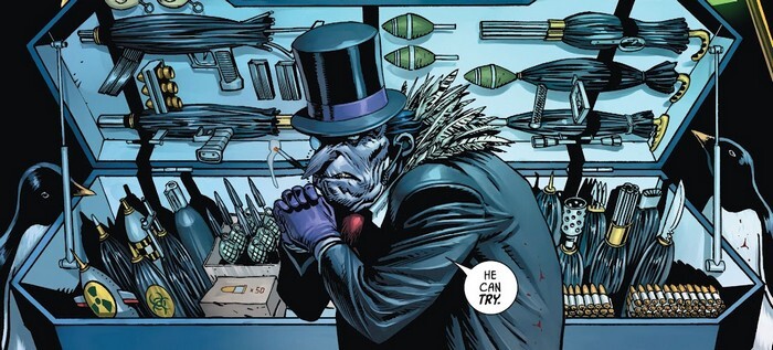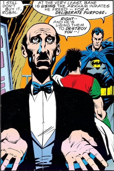 А впереди маячит комикс Batman #58. После очередного расколбаса за решётку попадает Пингвин – и идёт на встречу с Бэйном. Через некоторое время он уже на свободе – идёт оплакивать Пенни, свою жену, которая была найдена с перерезанным горлом. Своим подчинённым Пингвин приказывает подготовить две могилы. Одну для Пенни, и вторую – для него самого. Он чувствует, что долго не проживёт. В принципе, смерть его жены была не случайной – это было послание от Бэйна, мол, “я тебя жду, надо поговорить лично”. Бэйн дал Пингвину новое задание. Он недоволен развитием ситуации с Мистером Фризом - Брюсу Уэйну удалось добиться того, чтобы Мистер Фриз не сел, и, соответственно, не стал подчинённым Бэйна. “Уэйна надо наказать, иначе Бэйн накажет нас по всей строгости. – Понятно, босс. Грохнем Уэйна? – Нет. Ничего столь радикального. Нужно просто намекнуть ему на неотвратимость наказания. Мы убьём его дворецкого”.