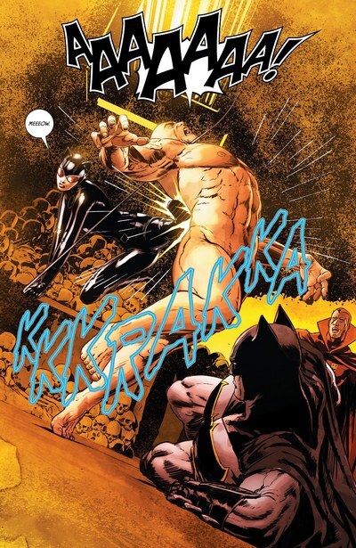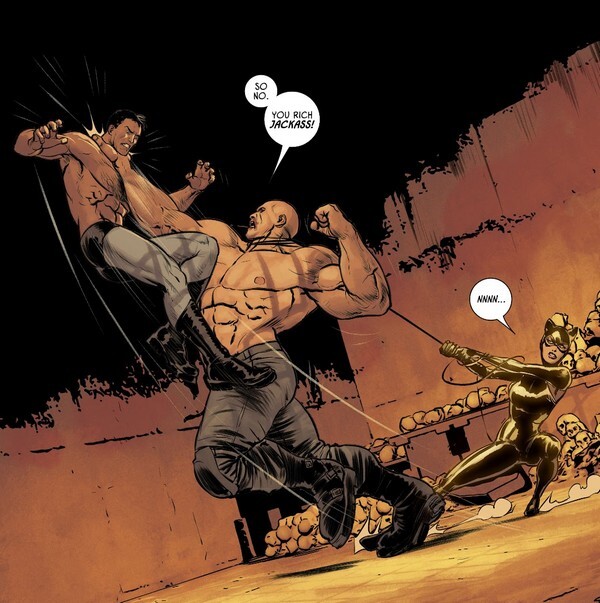 Бронзовый Тигр исполняет свою часть плана – “дарит” Панча и Джувили Бэйну. “Я привёл их! Единственного человека, которому удалось сбежать из твоей тюрьмы, и ту, ради которой он сбежал! Я хочу убить Бэтмэна, и лишь ты был близок к этому. Обучи, дай совет, поделись Отравой, штоле”. И-и-и тут объявляется Кошка. “Бэйн, не слушай его, он брешет, как собака. Это всё план Бэтмэна, эти трое должны тебя отвлекать, пока я буду похищать Психо-Пирата!”. Возмутившейся было Джувили Кошка прописывает когтями по горлу, с летальным для Джувили исходом, как и метнувшемуся было спасать возлюбленную Панчу. Опять-таки, убив его на месте. Бэйн впечатлён, а Кошка выдвигает своё предложение: “Ты мне – много денег, самолёт и возможность исчезнуть, я тебе – способ наконец-то сломать Бэтмэна раз и навсегда!”.