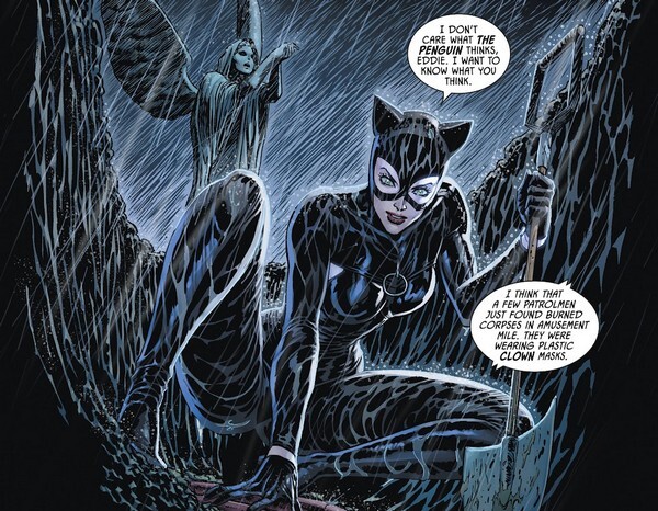 А значит, впереди комикс Batman #88. На кладбище Готэма Женщина-Кошка усердно машет лопатой, заодно дозваниваясь до Загадочника. “Кошка, тебе явно что-то от меня надо. Но с чего бы мне помогать подружке Бэтмэна? – Потому что я знаю, что ты в Готэме, у меня острые когти и плохое настроение, и я тебя найду! – Ок, спрашивай. – Я думала, мы с ЭТИМ закончили. Похоронили ЭТО здесь, на кладбище. – ЭТИМ уже занимается Пингвин. Надеется разобраться, пока ЭТО не вылилось в полномасштабную стычку. Киса, когда Дизайнер предложил тебе, мне и Пингвину совершить идеальное преступление, мы были не одни. У него был ещё один партнёр. Не знаешь, где сейчас Джокер? – Уже знаю”. Кошка раскапывает могилу, открывает гроб и видит там тело Джокера. А Бэтмэн узнаёт от Баллока, что преступники вышли из камер Чёрного Блока... и пропали. Словно кто-то их похитил. Бэтмэн спешит на место происшествия! А Загадочник издевается. “О, Селина, обман даётся тебе легко! Ты ничего не сказала Бэтмэну! Как думаешь, он продолжит любить тебя так же сильно, когда узнает, что ты помогла создать? Или вновь увидит тебя, как очередную злодейку, которую ему нужно сразить? О, Селина, я-то знаю, мы все умрём, но мне греет душу осознание того, что тебе достанется жёстче всех!”. Кошка собирается уже звонить Бэтмэну и во всём признаваться – но получает лопатой по голове, а из полуразложившейся глотки Джокера раздаётся голос: “Он тебя не слышит, Киса! Я предупреждал, что стучать не стоит. Эх, Киса, ты меня сразила до того, как я успел совершить идеальное преступление, которое увековечило бы меня. Пора за это заплатить!”.