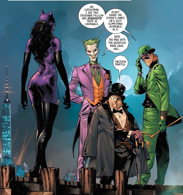 Но сегодня порцию Бэт-приключений пора закруглять, и припарковать Бэтмобиль стоит на комиксе Batman #90 за май 2020 года, от Джеймса Тиниона, Гийема Марша и Карло Пагалаяна. Дроны летят за Дэфстроуком, и джойстик от них в руках у Харли! Дроны начинены резиновыми пулями, несмертельными, но град таких пуль всё равно будет неприятным, а если постараться, можно и последний глаз Слейду выбить! А Кошка рассказывает Бэтмэну свою мрачную тайну. Несколько лет назад таинственный Дизайнер пригласил её, Пингвина, Джокера и Загадочника на встречу. Селине тогда сразу было не по себе – за ними прибыла лодка, которой управлял живой мертвец, а поместье Дизайнера носило название “Тартар”. “Славное время было...когда ты пытался быть примером для Робина, чтобы он не совершал твоих ошибок... – Нет времени на ностальгию, Селина! – Должно быть. Потому что без чувства ностальгии ты не поймёшь, что к чему”. Кошка объясняет: Дизайнер рассказал, что в прошлом у него был враг, детектив, и вечные стычки с этим детективом привели Дизайнера к выводу, что ему нужно резко эволюционировать. Что он и сделал, и решительно победил детектива раз и навсегда. Ну и после этого предложил Джокеру, Пингвину, Загадочнику и Женщине-Кошке тоже эволюционировать, чтобы раз и навсегда победить Бэтмэна.
