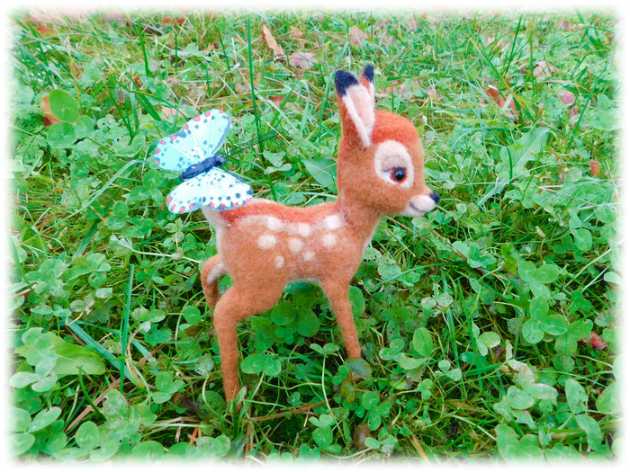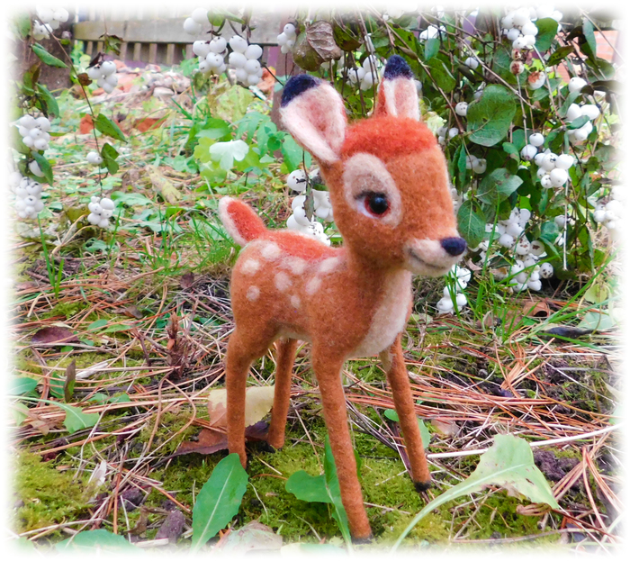 Олененок полностью подвижен благодаря проволочному каркасу. Ноги и хвост сгибаются, голова поворачивается.