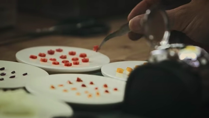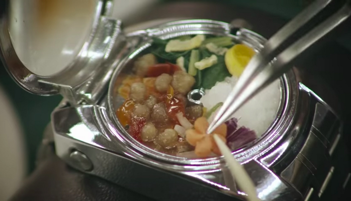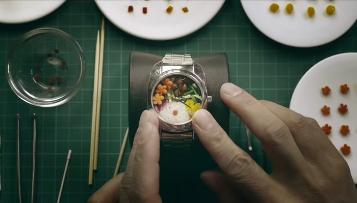 Часовщик разработал сами часы, пластический хирург нарезал крошечные порции овощей. Затем повар приготовил бэнто из этих заготовок, а мастер по созданию диорам уложил порцию в часовой корпус диаметром 30 мм - так, чтобы не мешать стрелкам ходить.