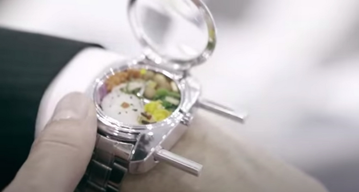 Циферблат закрыт открывающимся стеклом, внутри корпуса находятся палочки для еды. Главное - есть очень аккуратно. Часы были созданы для рекламной кампании, в серийное производство их не запустят. А зря)