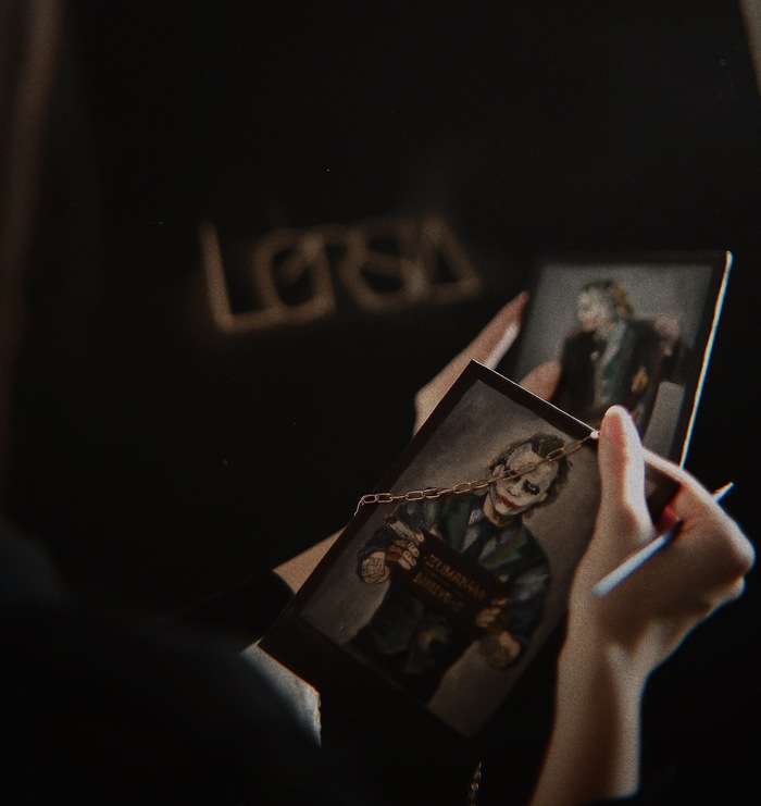 По запросу покупателя, работа была дополнена ещё парой маленьких картин с изображением Джокера) их я написала так же маслом, а способ крепления к основной картине - на неодимовых магнитах (один наклеен на оборотную часть холста с джокером, другой - с золотой цепочкой, крепится с оборотной стороны бэтмобиля).