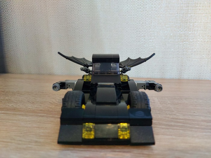 Получился гибрид болида Ф1 и бэтмобиля. Немного "горбатый" из-за короткой базы. (издержки нехватки деталей), но в целом, с определенных ракурсов, модель выглядит вполне достойно.
