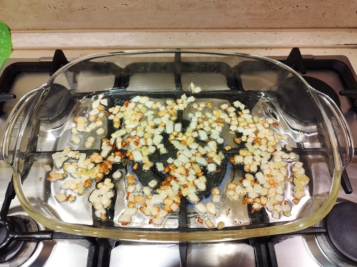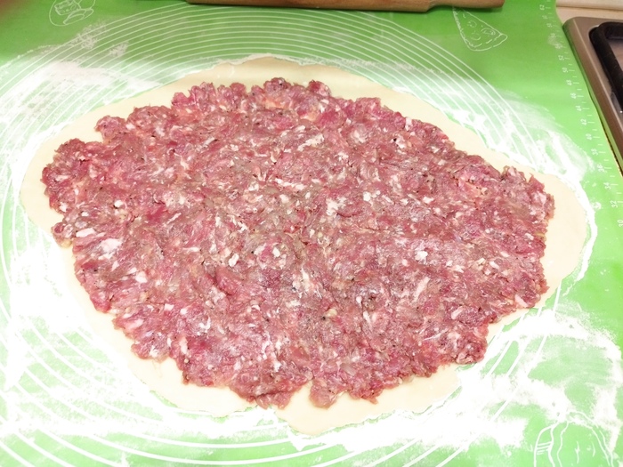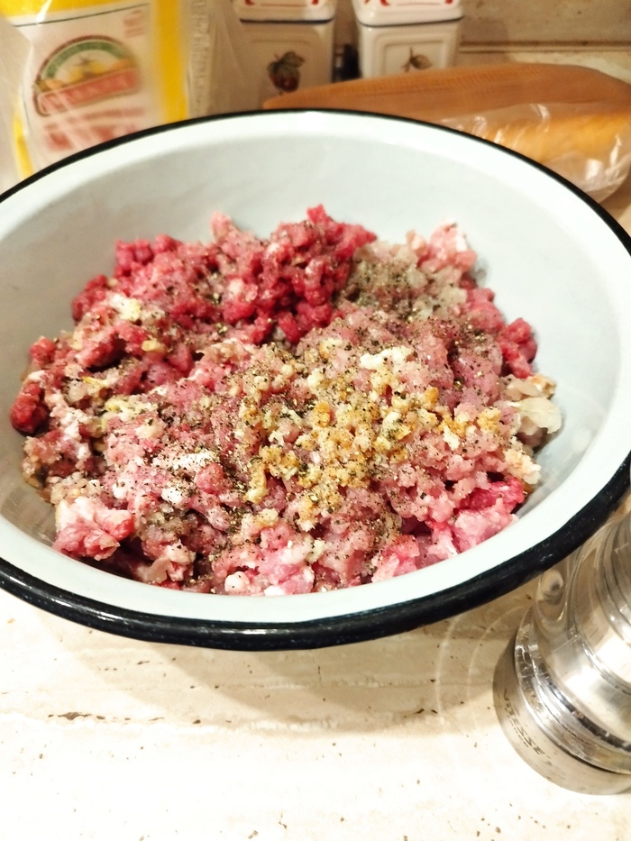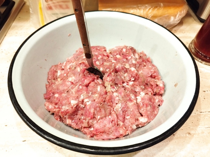 Пока тесто подходило. Сделала начинку. Лук нарезала мелким кубиком, добавила его в фарш, соль и перец по вкусу.