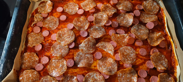 Недели две назад, заказывали пиццу с доставкой. Бренд называть не буду, рекламу их пиццы часто крутят по телеку, но нам она не понравилась! Тесто толстое, начинка не вкусная.