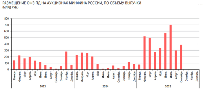 Спрос в 26249 составил 112,4₽ млрд, выручка — 65,2₽ млрд (средневзвешенная цена — 84,77%, доходность — 15,17%). Спрос в 26247 составил 25,8₽ млрд, выручка — 11,6₽ млрд (средневзвешенная цена — 85,78%, доходность — 15,23%). Минфин заработал за этот аукцион 76,8₽ млрд (в прошлый — 204₽ млрд). Согласно плану Минфина на IV кв. 2025 г. необходимо разместить 1,5₽ трлн (разместили 318,7₽ млрд, осталось 10 недель), есть пояснение: "в случае внесения изменений в закон о федеральном бюджете на 2025 г. плановые параметры по объёму размещения ОФЗ подлежат уточнению" (как раз под увеличение на 2,2₽ трлн).