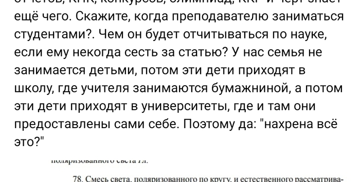“Что-то они у нас совсем ничего не делают!”, - в какой-то момент решили в министерстве высшего образования (которое, кстати, активно занято постоянным переименованием себя любимого, чем уже доставляет немало хлопот), и приподняли норму часов учебной нагрузки. Сначала на одну соточку часов, потом ещё, и, как в старом анекдоте, “по соточке, по соточке, весь огород и вскопали”: получили допустимый уровень 900 часов учебной нагрузки в год (для доцента, напоминаю). При этом, надо понимать, что это, скорее, нижняя граница: если у тебя 890 часов, то тебе периодически будут выговаривать, что ты, собака серая, объедаешь государство, а если у тебя 920, то, вроде, ну и ладно (“чё, из-за 20 часов почасовку оформлять что-ли?”). “Стоп!” , - сказали преподаватели, - “а вы там вообще в курсе, что нельзя просто проснуться и начать читать лекцию? надо хотя бы самому разок прочитать про то, что рассказывать собрался”. В министерстве почесали репу и вкатили инновацию: “вторую половину дня”, - т.е. теперь преподаватель должен отчитываться за то время, когда в расписании его фамилия не значится, и шляется (в понимании министерства) этот дармоед черт знает где. В моём случае я обязан отчитаться суммарно минимум за 1470 часов в год. “Отчитаться”, значит, предоставить бумаги.