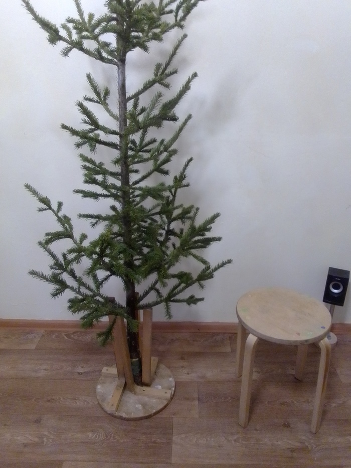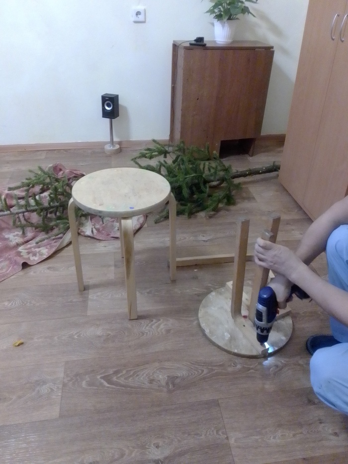 Чтобы сделать подставку для елочки развинтите ножки стула деревянного и привинтите их Г образными стойками вовнутрь. 3 минуты и готово как на фото: