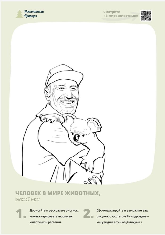 Чувствую - детям важно знать этого человека. Кто сейчас в их детстве хотя бы похож на Дроздова? Да, старые передачи не всегда идеальны по качеству - но детям на это, порой, наплевать. Как он говорит, что он говорит, как действует - вот это дети считывают. Я решил на этой неделе по всем своим каналам призвать подписчиков, читателей: давайте вспомним В Мире Животных, что связывало нас с этой передачей? Покажем её детям. Поделимся своими историями и теплом. Мы нарисовали вот такую раскраску на основе самой известной, наверное, фотографии Николая Николаевича, по куар коду там - один из любимых моих выпусков
