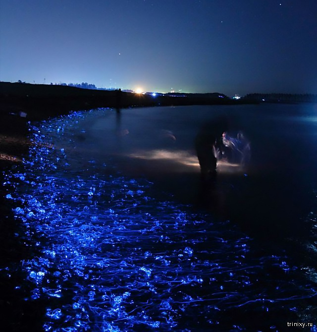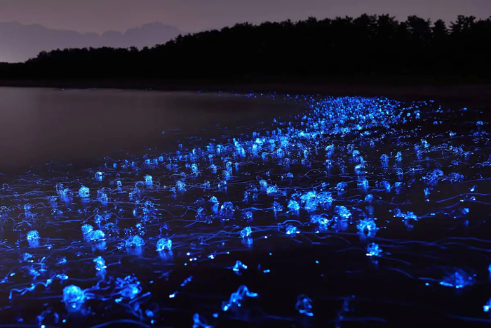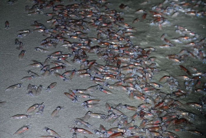 На самом деле это не представление, это практически оргия – а точнее, нерест. Каждую весну прибрежные воды японского залива Тояма оказываются залиты ярко-синим светом: это волны выносят на берег десятки тысяч малюсеньких кальмаров ватенсий, или кальмаров-светлячков.