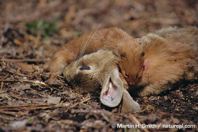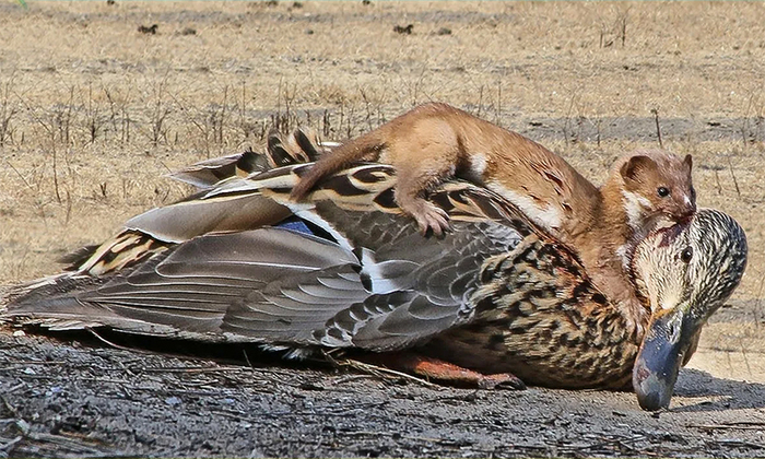 Запах секрета ласки настолько неприятный, что может отпугнуть даже крупного нападающего, ведь на любого хищника найдётся хищник побольше, и ласка не исключение. На неё охотятся куницы, лисицы, енотовидные собаки, но чаще прочих – крупные хищные птицы. Впрочем, если трюк с секретом-вонючкой не сработал, то ласка будет отбиваться, и в процессе всё может встать с ног на голову: например, коршун, попытавшийся напасть на ласку, порой становится её добычей. То, что на фото произошло с уткой, запросто может произойти и с неопытной хищной птицей.