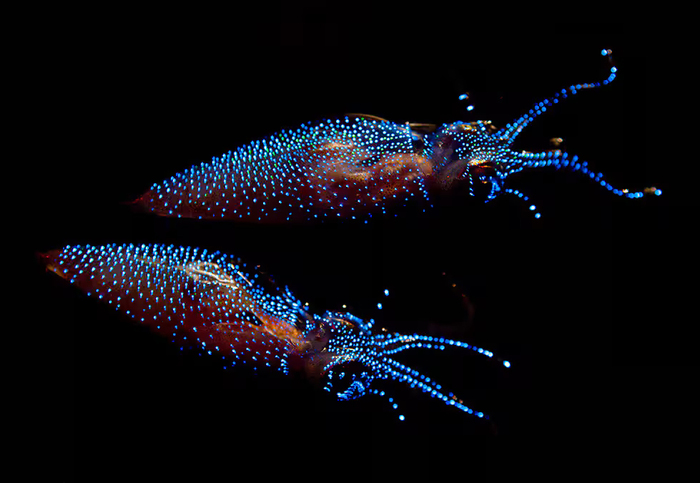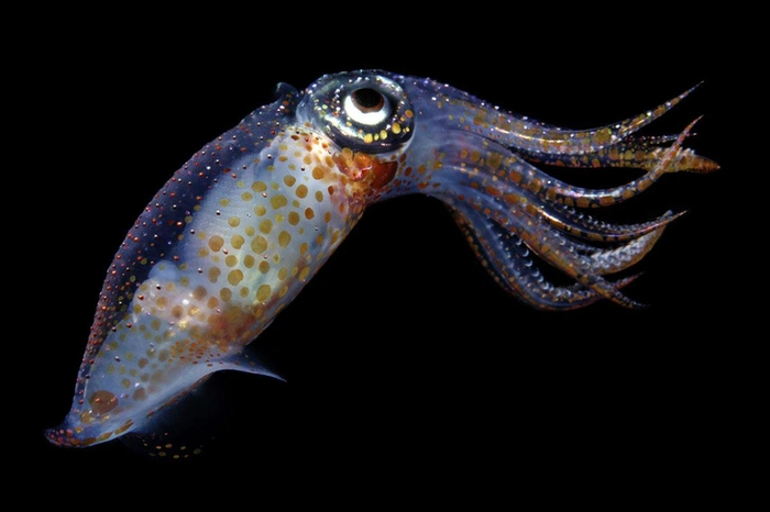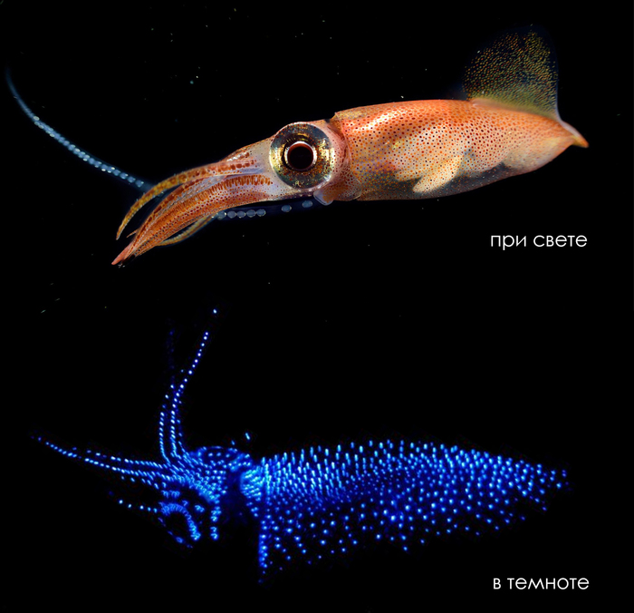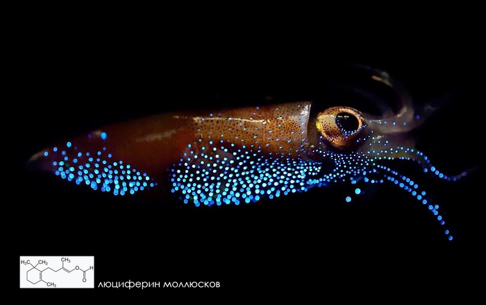 Тело этого маленького кальмара, длиной не более 7 см, покрыто множеством фотофоров (от 850 до 1100 у одной особи) – специальных органов, в которых и рождается биолюминесценция за счёт окисления особого вещества люциферина кислородом в присутствии фермента люциферазы.