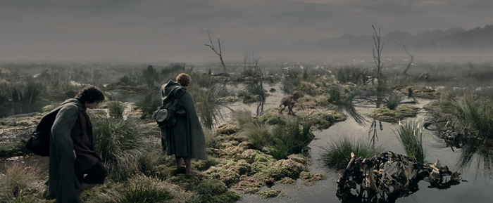 Пожалуй, одно из самых страшных мест в экранизации "Властелина колец", по крайней мере для меня, — это эпизод путешествия Фродо, Сэма и Голлума через Мертвые топи. Серая болотистая местность, которая буквально источает страх.
