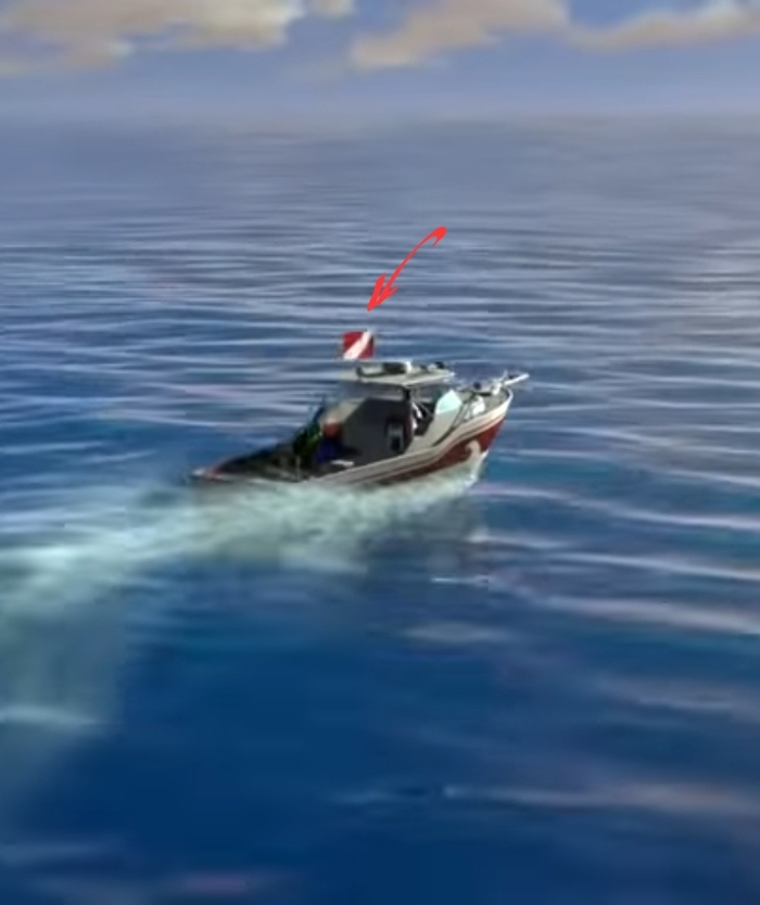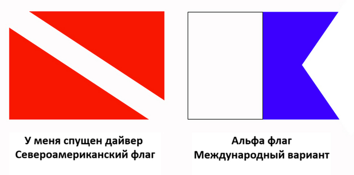 Водолазный флаг на лодке не соответствует стандарту. Флаг diver down (у меня спущен водолаз) - красное полотнище с белой диагональной полосой из левого верхнего угла в правый нижний: