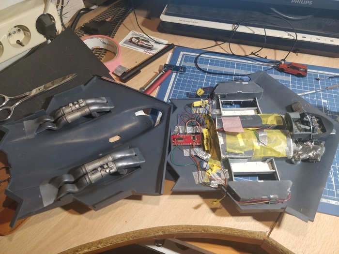 после финишной сборки обнаружил, что не работают фары на передней стойке, и пару дней возился с проводкой 0.2мм, но все таки удалось спаять что надо.