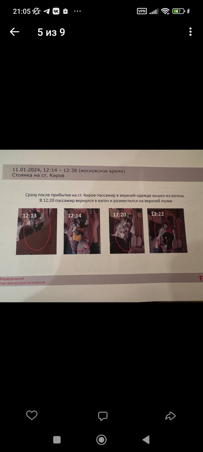 11 января, 12:14: во время стоянки на станции Киров пассажир выходит из вагона проветриться. Переноску с Твиксом оставляет под полкой. В 12:20 возвращается, в 12:22 залезает на верхнюю боковую полку.