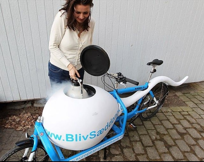 Европейский Банк Спермы (Nordisk Cryobank) - один из лидирующих банков спермы в Европе. Поэтому администрация нашла комфортный и экологически чистый способ доставлять сперматозоиды в клиники по искусственному оплодотворению Копенгагена. Будущие дети погружаются в холодильную камеру фирменного велосипеда (чтобы зря хвостиками не мотали и энергию не тратили), и курьер доставляет их в место назначения. Надпись на баке гласит "Станьте донором спермы".