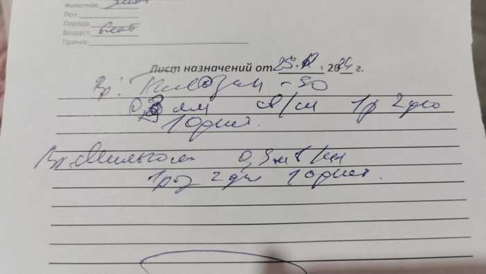 Тогда позвонила в компанию для того, чтобы у врача узнали расшифровку его же рецепта. Так как эта компания просто объединяет в основном неквалифицированных ветврачей, которые работают на себя, получается такая замысловатая схема. Мне сказали ожидать, что я и сделала и параллельно расшифровывала его записи уже со своими преподавателями ветеринарными врачами. Ждала день, ждала два, три. Звоню ещё несколько раз. Наконец, приходит ответ, который выбил меня из колеи. Второй препарат и его дозировка были изменены. После того как я больше половины курса проколола Мильгамма в назначенной дозировке.